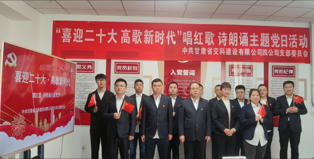金秋十月,偉大的中國共產黨即將迎來第二十次全國代表大會,為營造喜慶、熱烈、昂揚、振奮的濃厚氛圍,交科公司四公司黨支部于10月9日組織開展了“喜迎二十大 高歌新時代”唱紅歌、詩朗誦主題黨日活動。以紅歌獻唱、詩歌朗誦的方式,回顧黨的光輝歷程,謳歌黨的豐功偉績,進一步激發(fā)廣大職工的愛黨愛國熱情,展現(xiàn)了四公司全體職工昂揚向上、奮發(fā)有為的精神風貌。