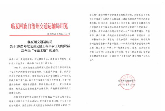 喜報(bào)!臨和二級公路(和政段)項(xiàng)目獲得2022年平安工地建設(shè)州級“示范工地”!