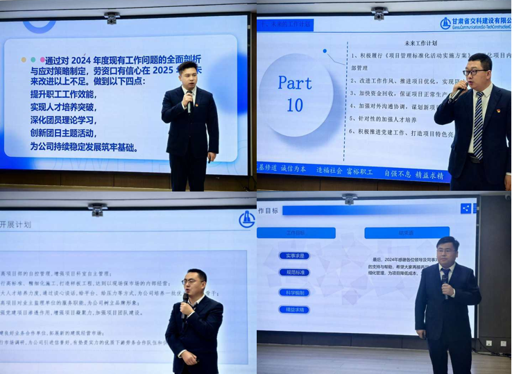 2025年是實現(xiàn)“十四五”規(guī)劃目標(biāo)任務(wù)的關(guān)鍵一年,也是交科公司三公司實現(xiàn)管理提升的突破一年,我們要緊跟集團公司及公司發(fā)展步伐,落實好如下工作:一是加強學(xué)習(xí),實現(xiàn)綜合提升。堅持學(xué)理論知識,提政治素養(yǎng)。學(xué)業(yè)務(wù)技能,提履職能力;二是奮力拼搏,推進(jìn)全員經(jīng)營新局面。全體職工要主動擔(dān)當(dāng)作為,在深耕蘭州新區(qū)主陣地的同時積極“走出去”,全力開拓臨夏、慶陽、平?jīng)龅仁?nèi)外新市場。在做強市政、基礎(chǔ)設(shè)施板塊的同時努力向水利水電、城市更新等新領(lǐng)域、新賽道全面邁進(jìn);三是強抓落實,推動管理再上新臺階。緊緊圍繞“強管理、抓效能、提服務(wù)、樹品牌”這一目標(biāo),著力提升職工安全質(zhì)量和成本管控意識、健全成本管控體系、夯實成本控制責(zé)任,切實提升工作效率,促進(jìn)各項工作走深走實;四是釋放潛能,激發(fā)人才活力。要關(guān)注職工成長和職業(yè)發(fā)展規(guī)劃,為職工提供施展才干的有效平臺。五是統(tǒng)一思想、凝聚共識、共謀發(fā)展。要始終秉持“發(fā)展企業(yè) 富裕職工”的理念,一切工作要以全體職工的切身利益為出發(fā)點和落腳點,上下一心、同舟共濟,為全面完成2025年各項任務(wù)指標(biāo)接續(xù)奮斗。