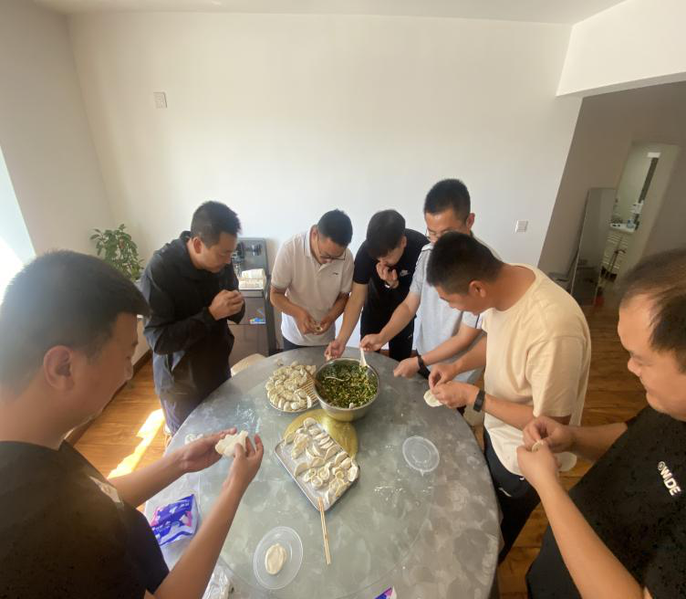 在三公司食堂,領(lǐng)導(dǎo)班子與職工一起包餃子、說家常。受疫情影響,很多職工無法回家與家人團(tuán)聚,公司組織職工團(tuán)聚包餃子,讓職工體會到了公司這個大家庭的溫暖和祝福。在輕松愉悅的氛圍中,大家和面的和面,搟皮的搟皮,拌餡的拌餡,包餃子的包餃子……各式各樣的餃子呈現(xiàn)在大家眼前,大家紛紛與自己的“作品”合影留念,食堂里洋溢著歡樂祥和的節(jié)日氣氛。