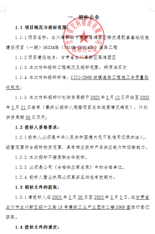 蘭州高新城市更新雁灘園區(qū)暢交通配套基礎(chǔ)設(shè)施建設(shè)項(xiàng)目(一期)S633#路(T610#-S601#路)道路工程材料招標(biāo)公告