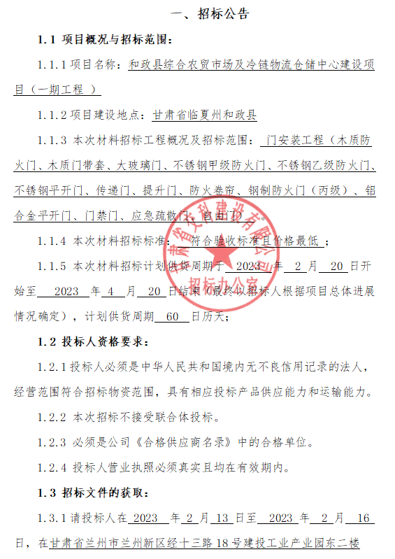 和政縣綜合農(nóng)貿(mào)市場(chǎng)及冷鏈物流倉(cāng)儲(chǔ)中心建設(shè)項(xiàng)目(一期工程 )材料招標(biāo)