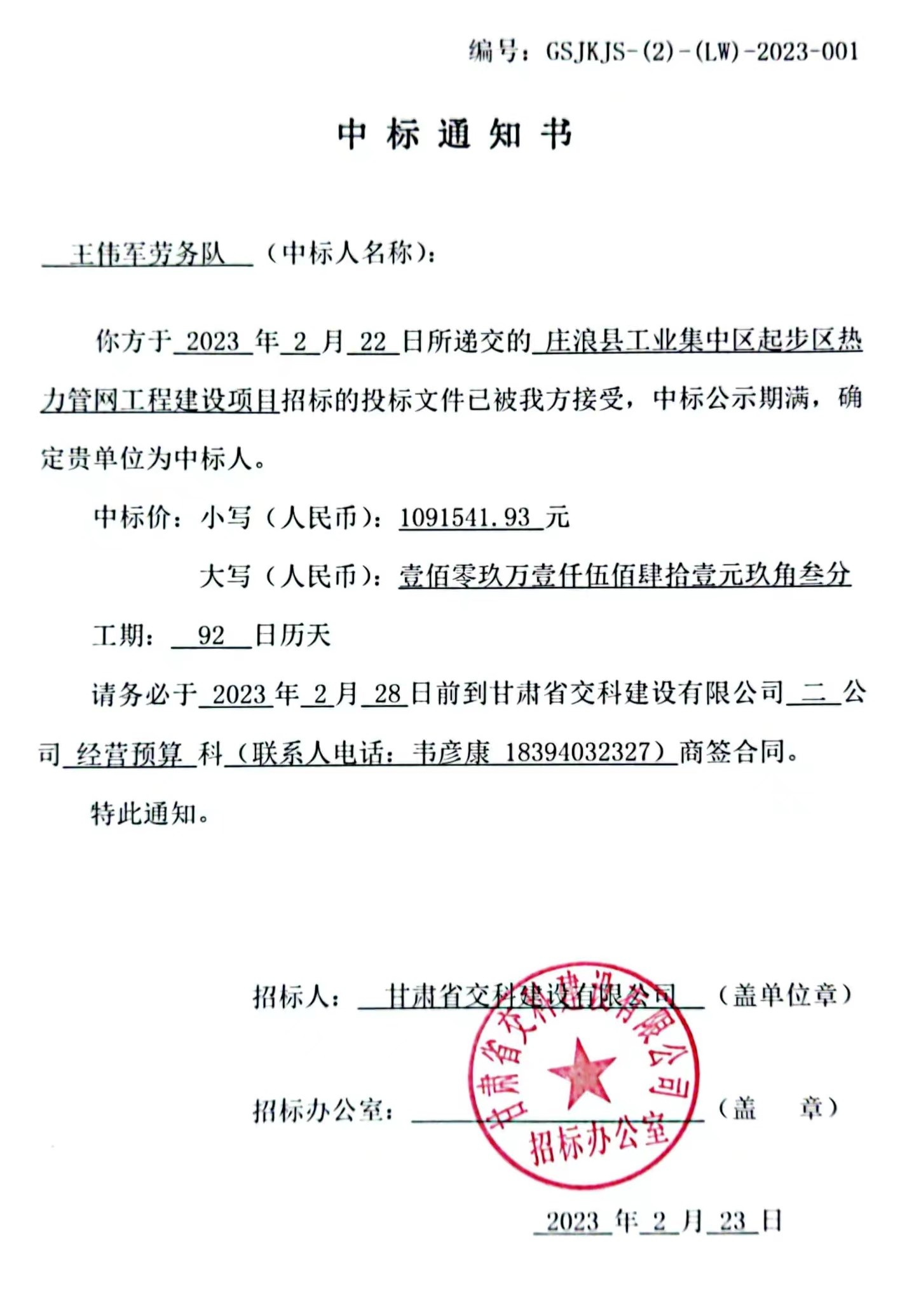 莊浪縣工業(yè)集中區(qū)起步區(qū)熱力管網(wǎng)工程建設項目中標候選人及中標通知書