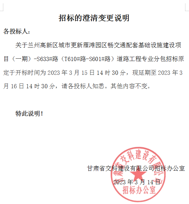 關(guān)于蘭州高新區(qū)城市更新雁灘園區(qū)暢交通配套基礎(chǔ)設(shè)施建設(shè)項目(一期)-S633#路(T610#路-S601#路)道路工程專業(yè)分包-澄清說明