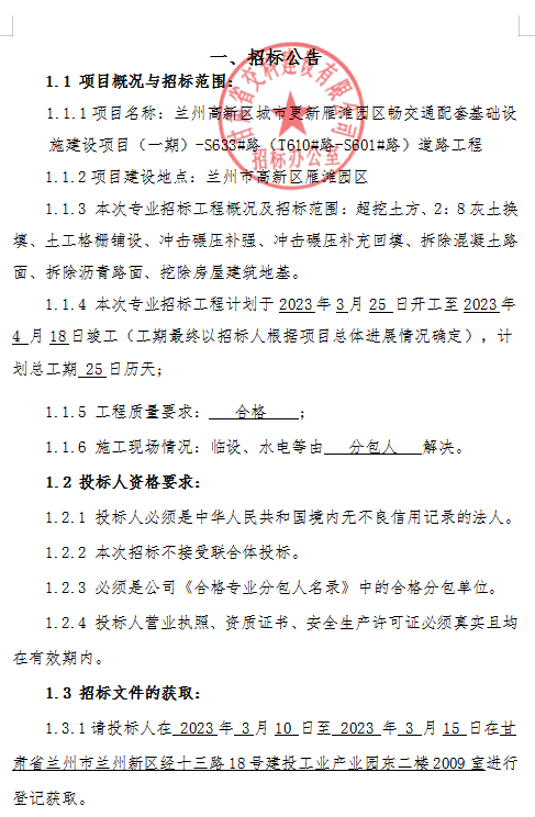 蘭州高新城市更新雁灘園區(qū)暢交通配套基礎(chǔ)設(shè)施建設(shè)項(xiàng)目(一期)-S633#路(T610#-S601#路)道路工程路基處理施工-招標(biāo)公告