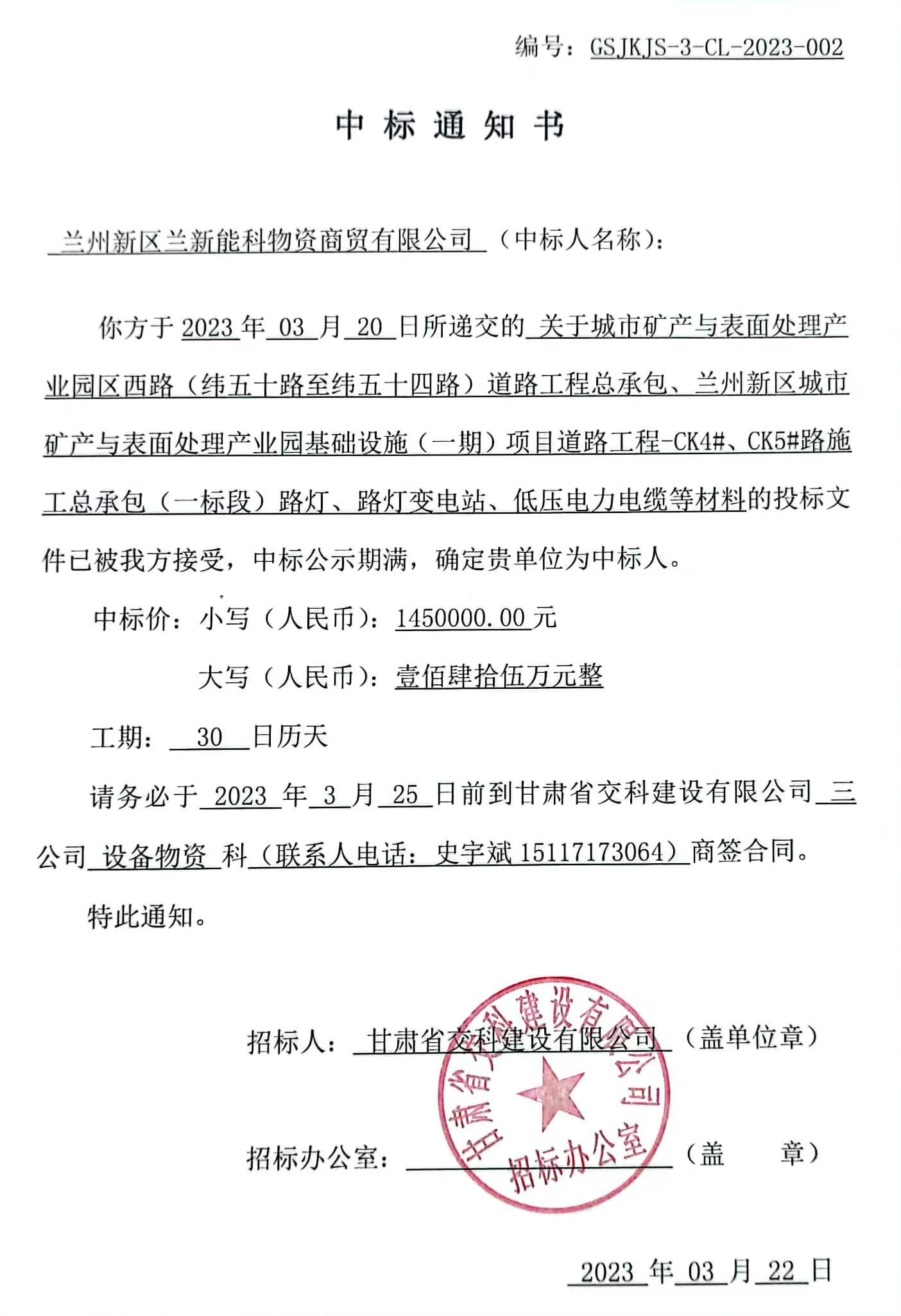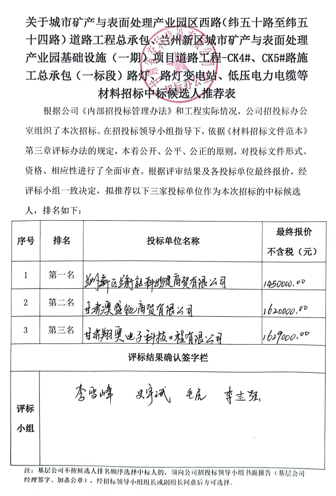 關(guān)于城市礦產(chǎn)與表面處理產(chǎn)業(yè)園區(qū)西路(緯五十路至緯五十四路)道路工程總承包、蘭州新區(qū)城市礦產(chǎn)與表面處理產(chǎn)業(yè)園基礎(chǔ)設(shè)施(一期)項(xiàng)目道路工程-ck4#、ck5#路施工總承包(一標(biāo)段)路燈等材料招標(biāo)中標(biāo)候選人及中標(biāo)通知書(shū)