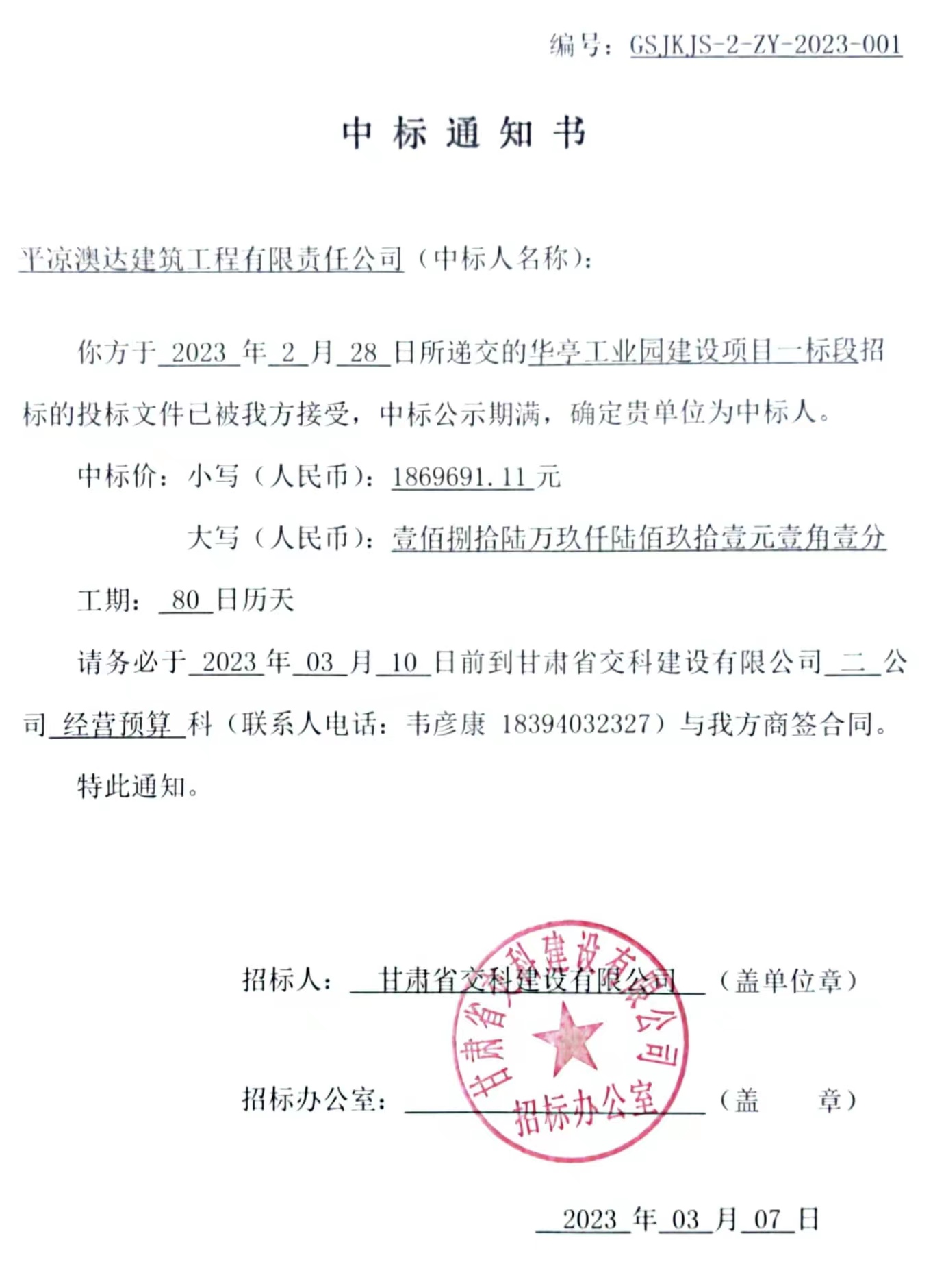 華亭工業(yè)園建設(shè)項目一標(biāo)段中標(biāo)候選人及中標(biāo)通知書
