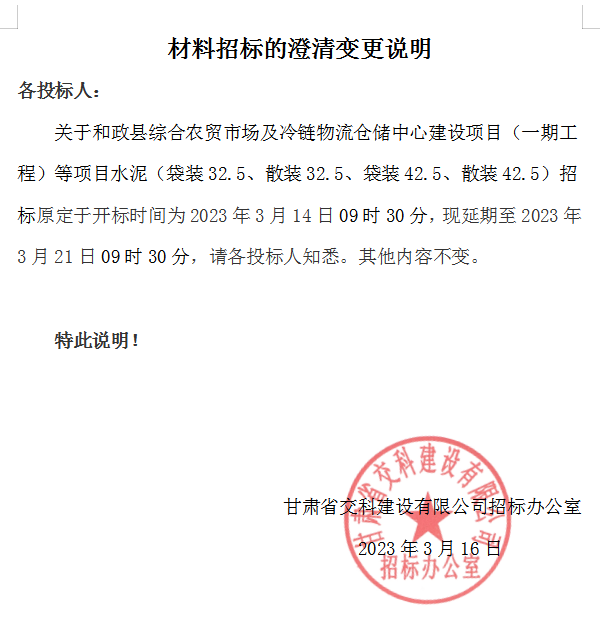 關(guān)于和政縣綜合農(nóng)貿(mào)市場及冷鏈物流倉儲中心建設(shè)項目(一期工程)等項目水泥招標(biāo)的澄清變更說明