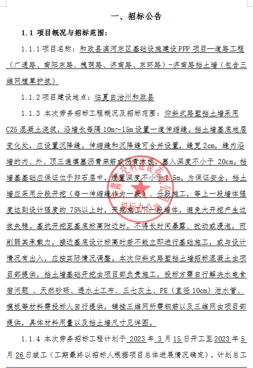 和政縣濱河?xùn)|區(qū)基礎(chǔ)設(shè)施建設(shè)PPP項(xiàng)目—道路工程(廣通路、南陽東路、槐蔭路、濟(jì)南路、東環(huán)路)-濟(jì)南路擋土墻(包含三維網(wǎng)植草護(hù)坡)招標(biāo)公告