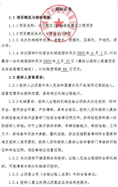 蘭州新區(qū)ZB15#道路建設(shè)工程項(xiàng)目機(jī)械租賃招標(biāo)公告