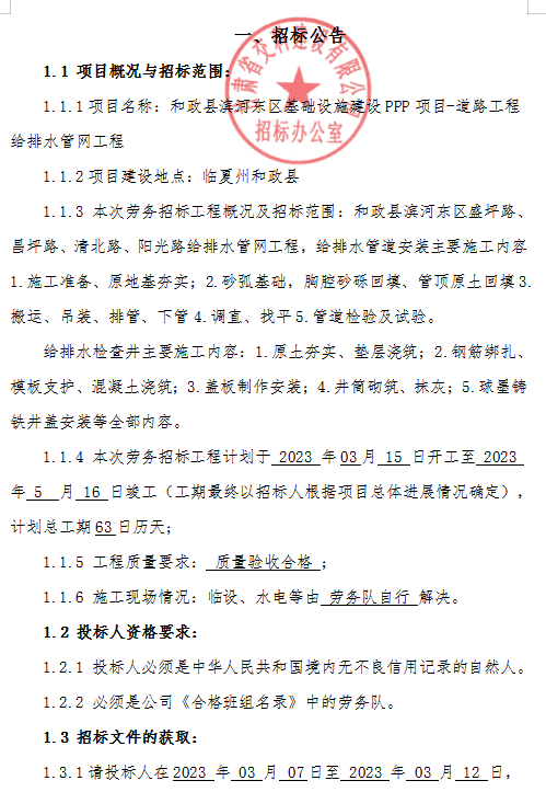 和政縣濱河?xùn)|區(qū)基礎(chǔ)設(shè)施建設(shè)PPP項(xiàng)目-道路工程給排水管網(wǎng)工程-招標(biāo)公告