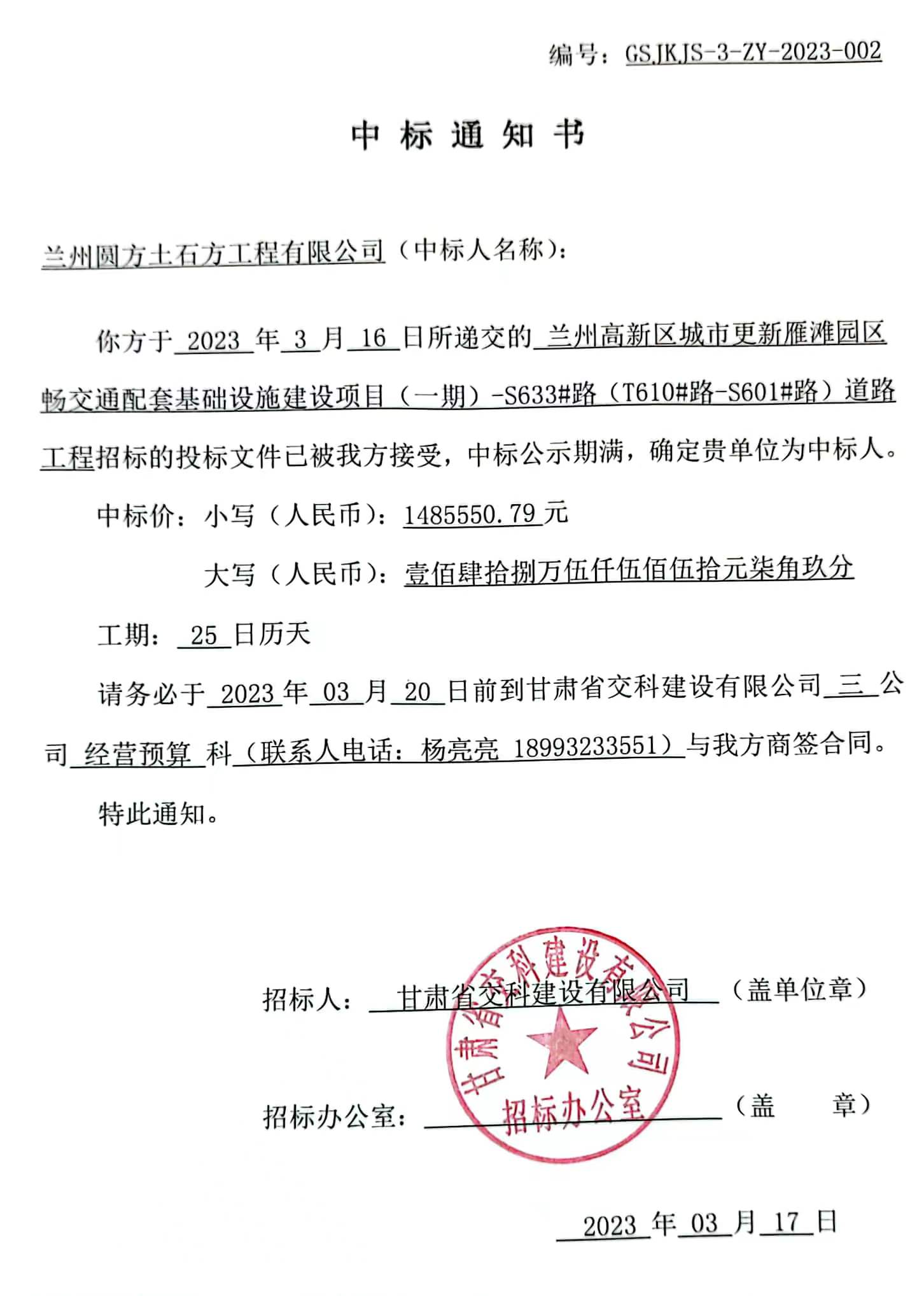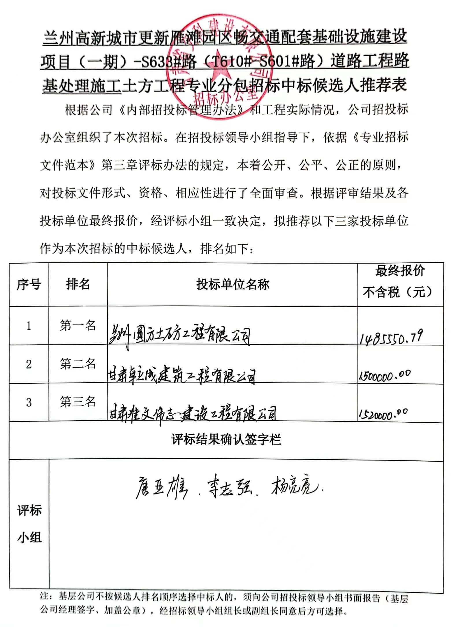 蘭州高新城市更新雁灘園區(qū)暢交通配套基礎設施建設項目(一期)-S633#路(T610#-S601#路)道路工程路基處理施工中標候選人及中標通知書