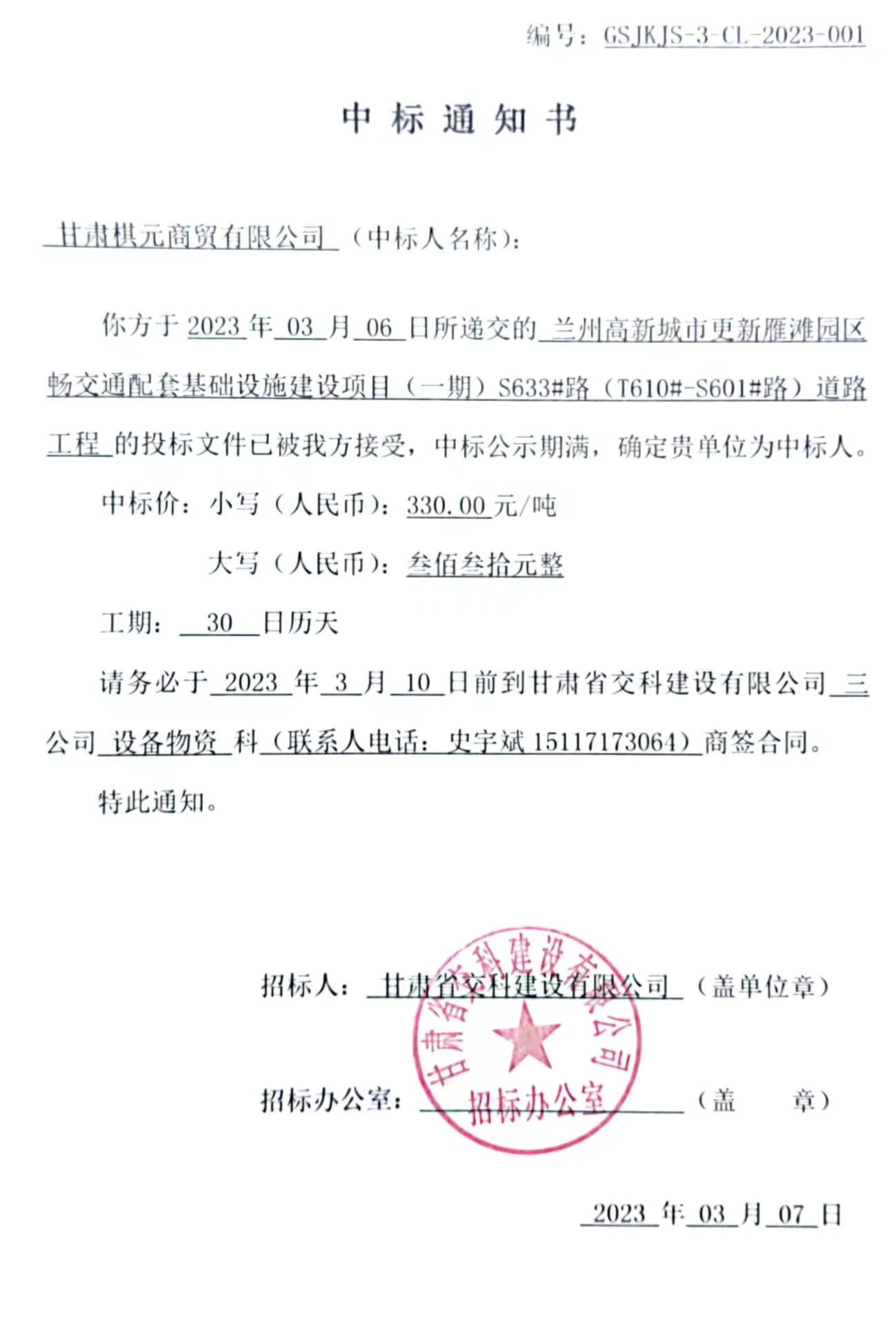 蘭州高新城市更新雁灘園區(qū)暢交通配套基礎(chǔ)設(shè)施建設(shè)項(xiàng)目(一期)S633#路(T610#-S601#路)道路工程中標(biāo)候選人及中標(biāo)通知書(shū)