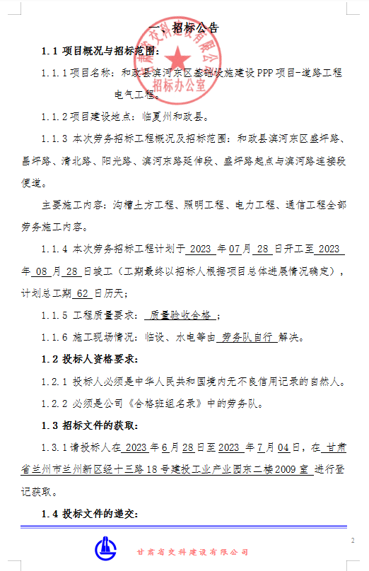和政縣濱河東區(qū)基礎設施建設PPP項目-道路工程電氣工程-招標公告