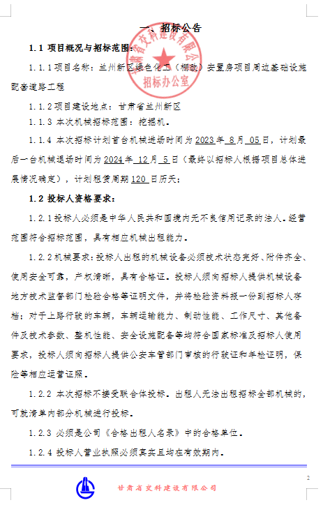 蘭州新區(qū)綠色化工(棚改)安置房項目周邊基礎設施配套道路工程機械租賃招標公告