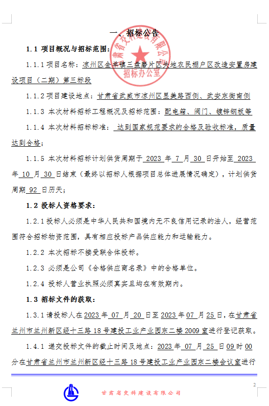 涼州區(qū)金羊鎮(zhèn)三盤磨片區(qū)失地農(nóng)民棚戶區(qū)改造安置房建設(shè)項目(二期)第三標段材料招標公告