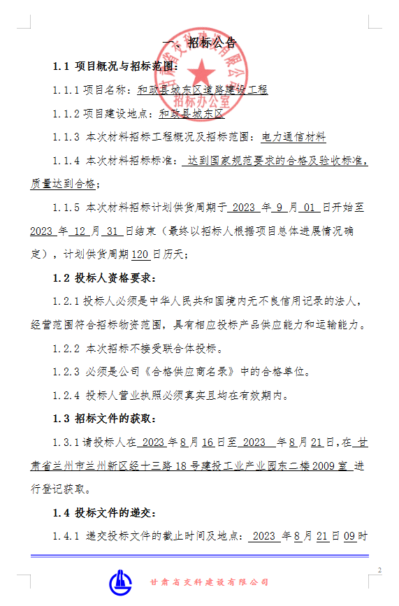 和政縣城東區(qū)道路建設(shè)工程-電力通信材料-招標(biāo)公告