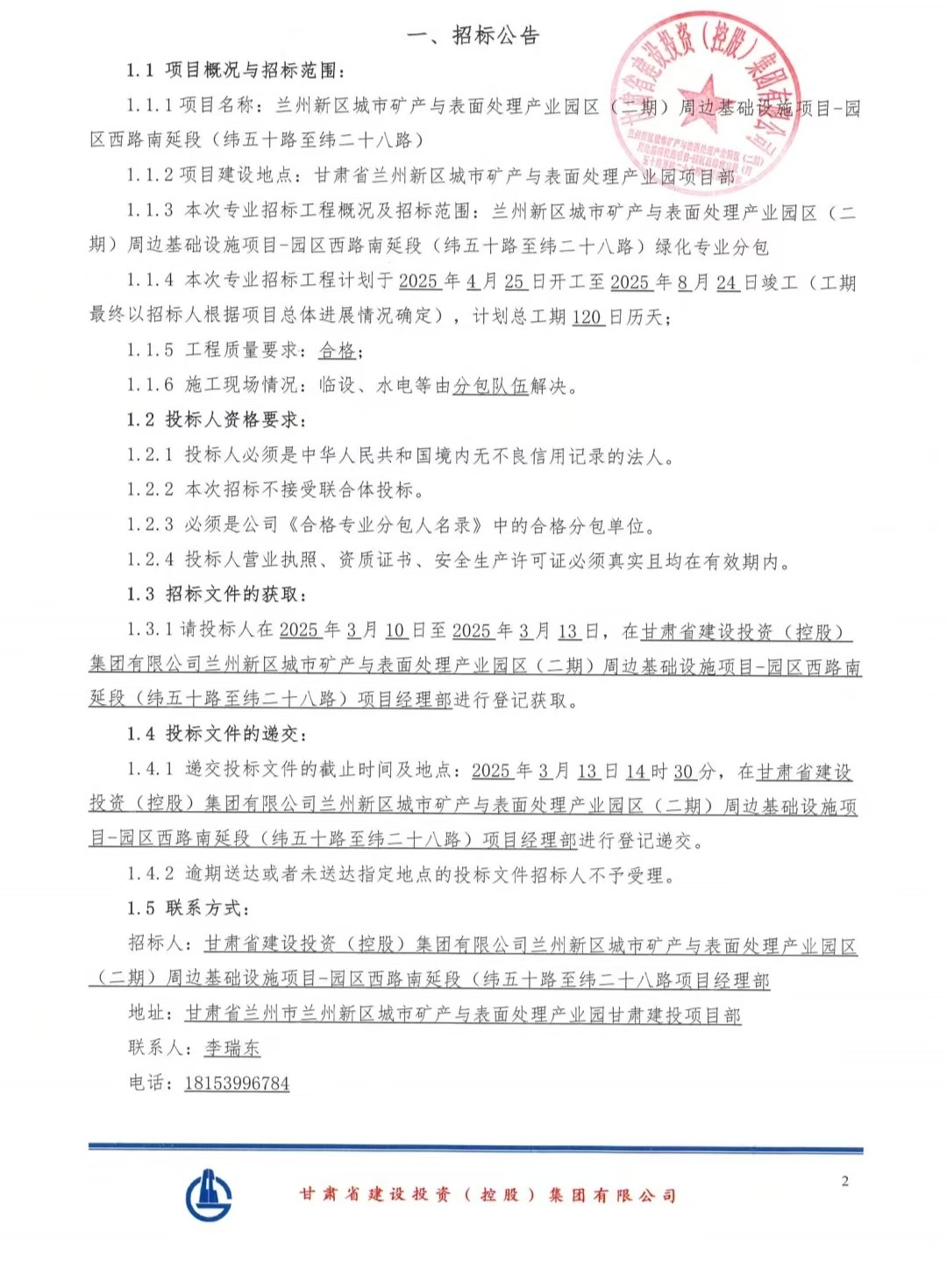 蘭州新區(qū)城市礦產(chǎn)與表面處理產(chǎn)業(yè)園區(qū)(二期)周邊基礎(chǔ)設(shè)施項(xiàng)目-園區(qū)西路南延段(緯五十路至緯二十八路)綠化專(zhuān)業(yè)分包-招標(biāo)公告