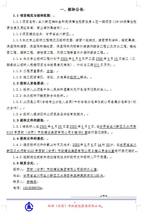 蘭州新區(qū)瑞玲金和苑保障性租賃住房A區(qū)一期項(xiàng)目(19-1#保障性租賃住房及周邊車庫、商業(yè)等附屬結(jié)構(gòu))專業(yè)分包招標(biāo)公告