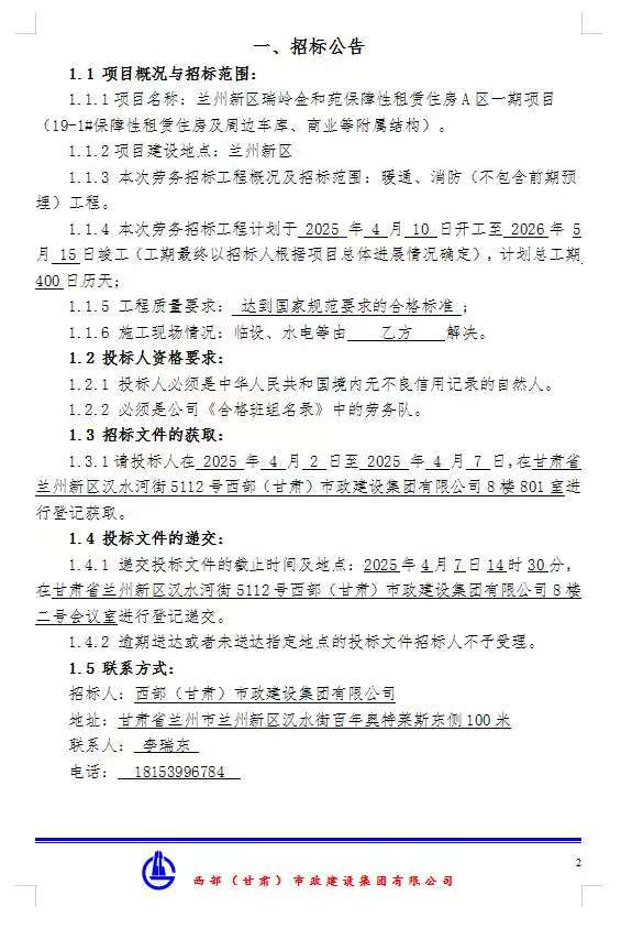 蘭州新區(qū)瑞嶺金和苑保障性租賃住房A區(qū)一期項目-19#-1#保障租賃住房及周邊車庫、商業(yè)等附屬結(jié)構(gòu)-暖通、消防勞務分包招標公告