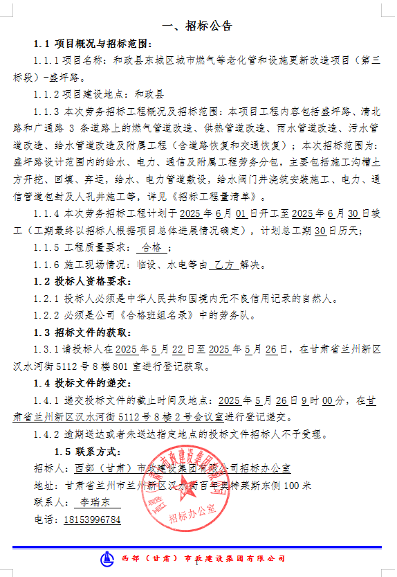 和政縣東城區(qū)城市燃?xì)獾壤匣芎驮O(shè)施更新改造項(xiàng)目(第三標(biāo)段)-盛坪路-勞務(wù)招標(biāo)公告