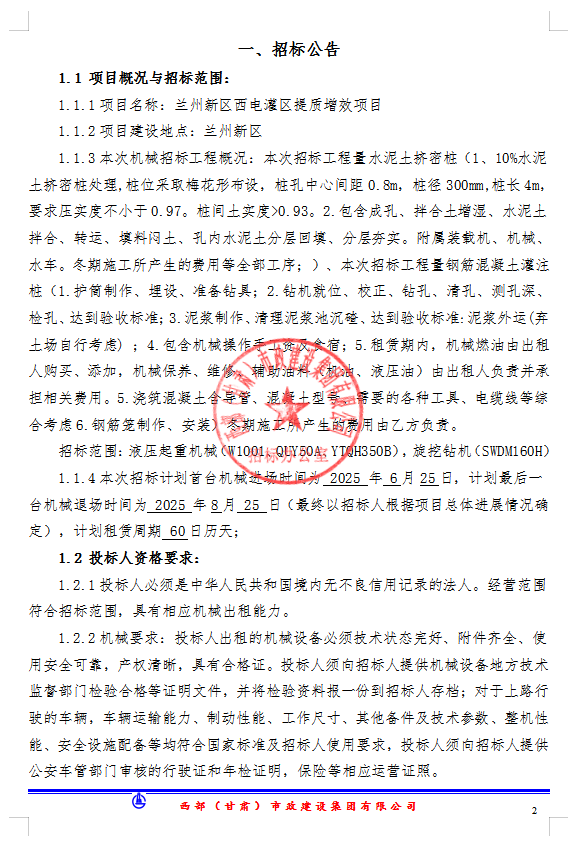 蘭州新區(qū)西電灌區(qū)提質(zhì)增效項(xiàng)目-機(jī)械租賃招標(biāo)公告