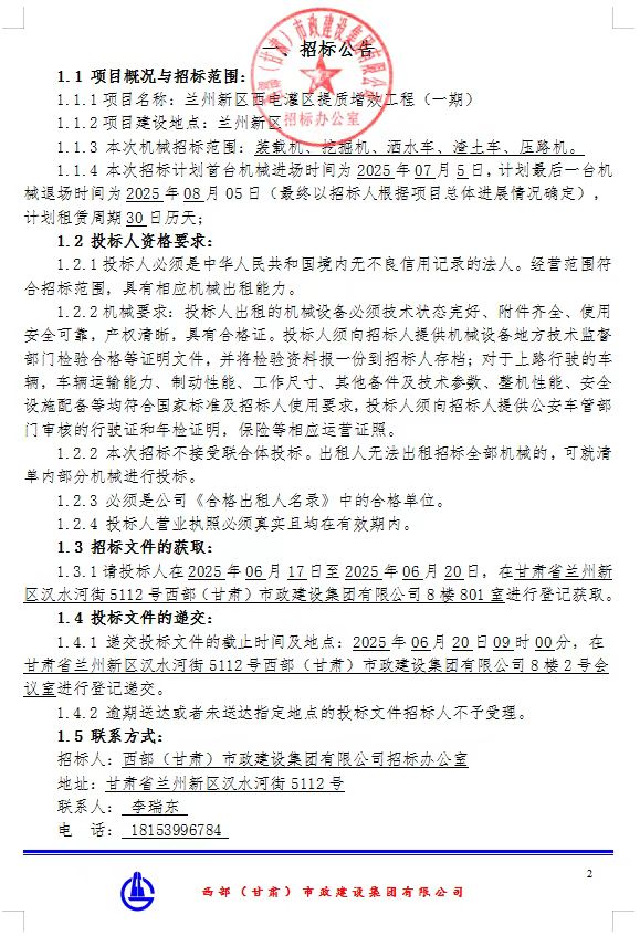 蘭州新區(qū)西電灌區(qū)提質(zhì)增效工程(一期)機械租賃-招標公告