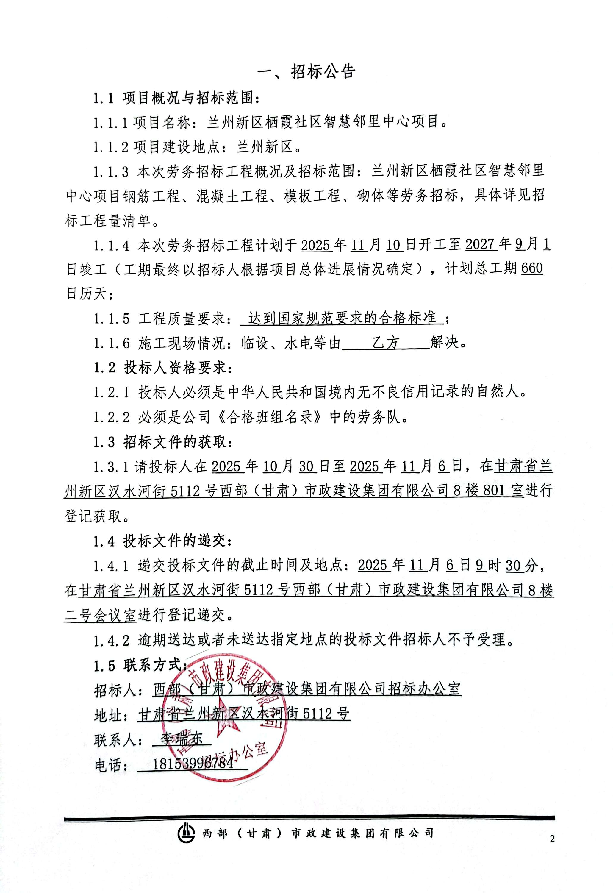 蘭州新區(qū)棲霞社區(qū)智慧鄰里中心項目-鋼筋工程、混凝土工程、砌體工程等勞務(wù)-招標公告